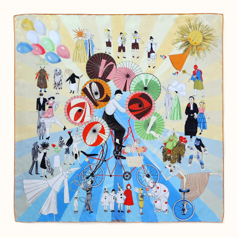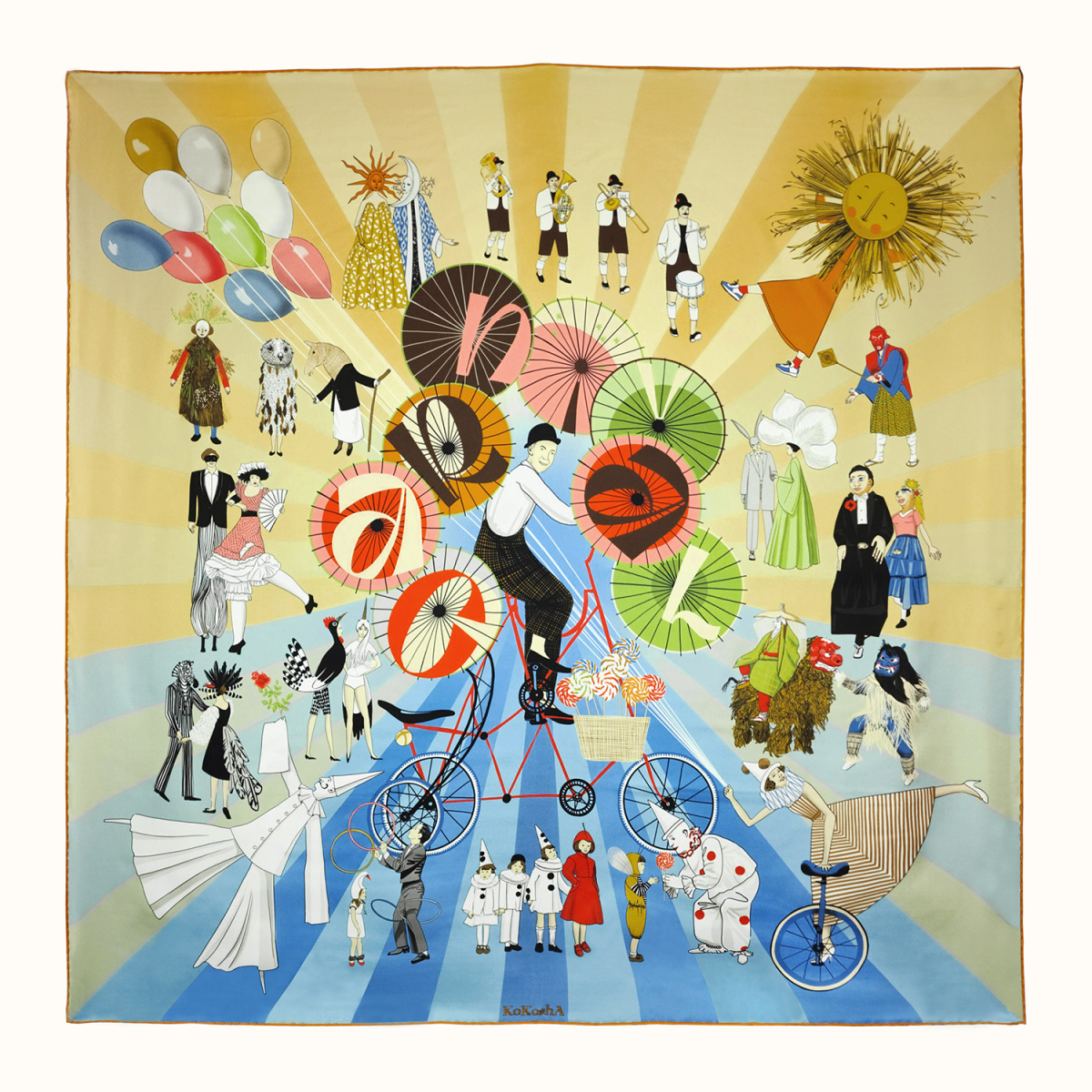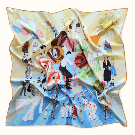 Scarf "CARNIVAL" silk 90x90 on a yellow background