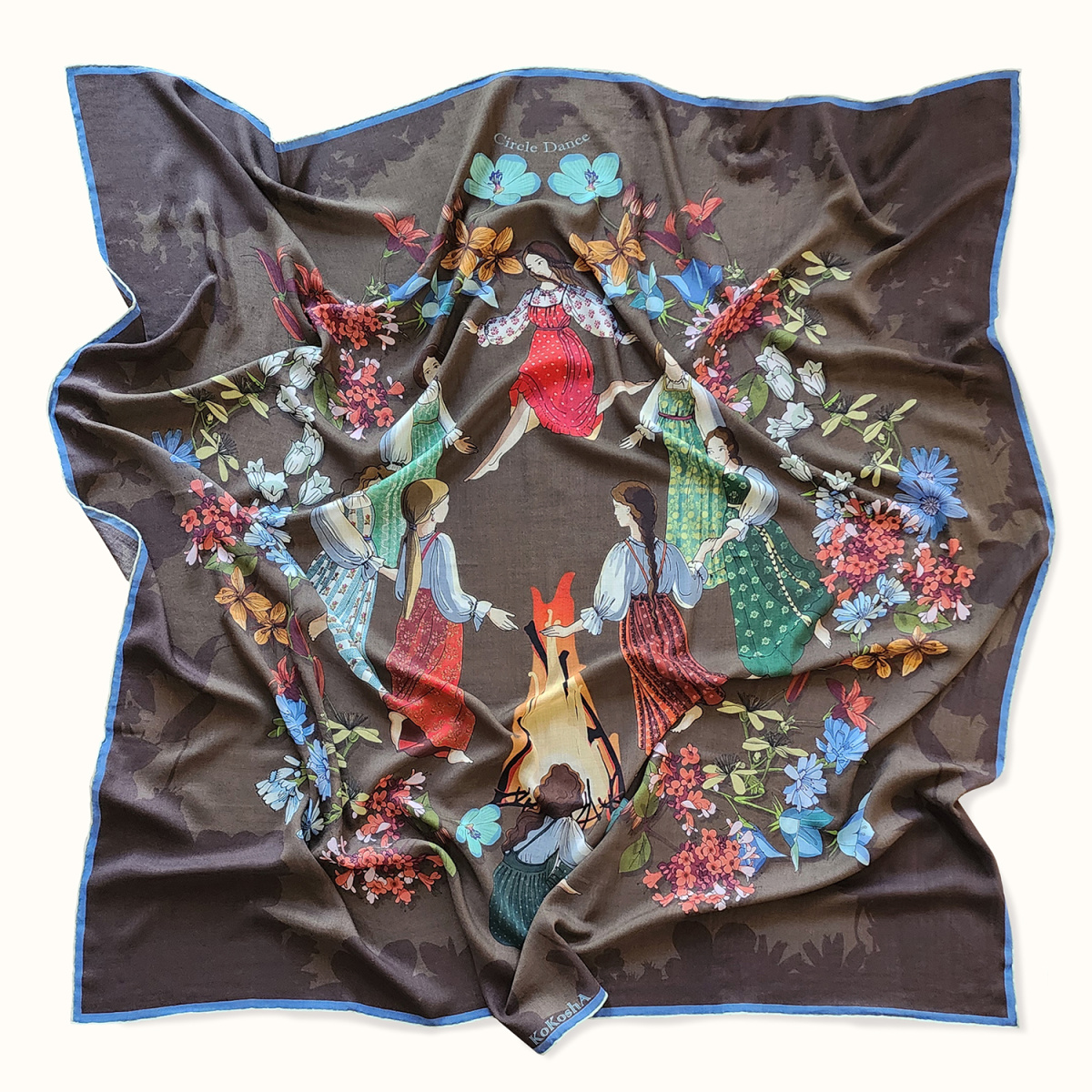 Shawl "ROUND DANCE" wool 135x135 on a chocolate background